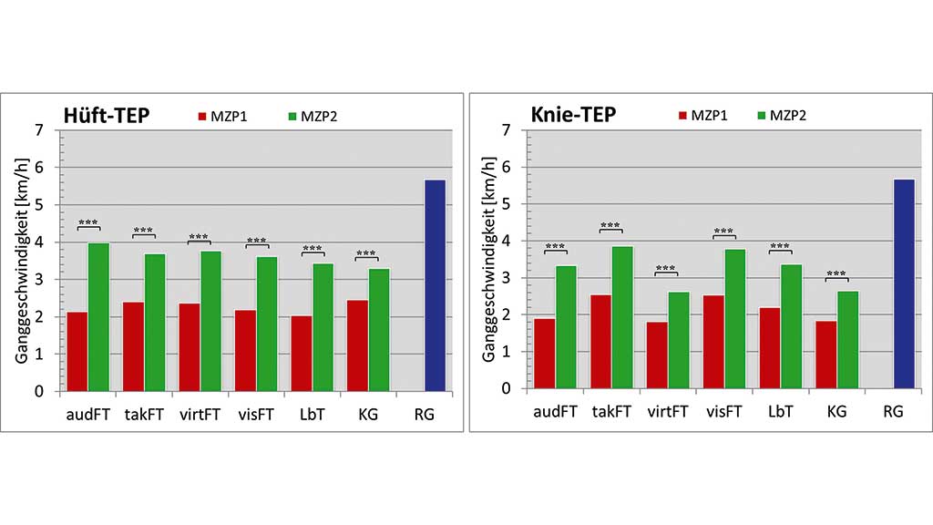 Nach Knie-TEP zeigen im Vergleich aller IGs das audFT und das takFT die größten Verbesserungen bei Geschwindigkeit, Kadenz und Schrittlänge (nur audFT) ebenso wie auch die größten Zunahmen des Bewegungsumfangs im Kniegelenk (Abb. 11).