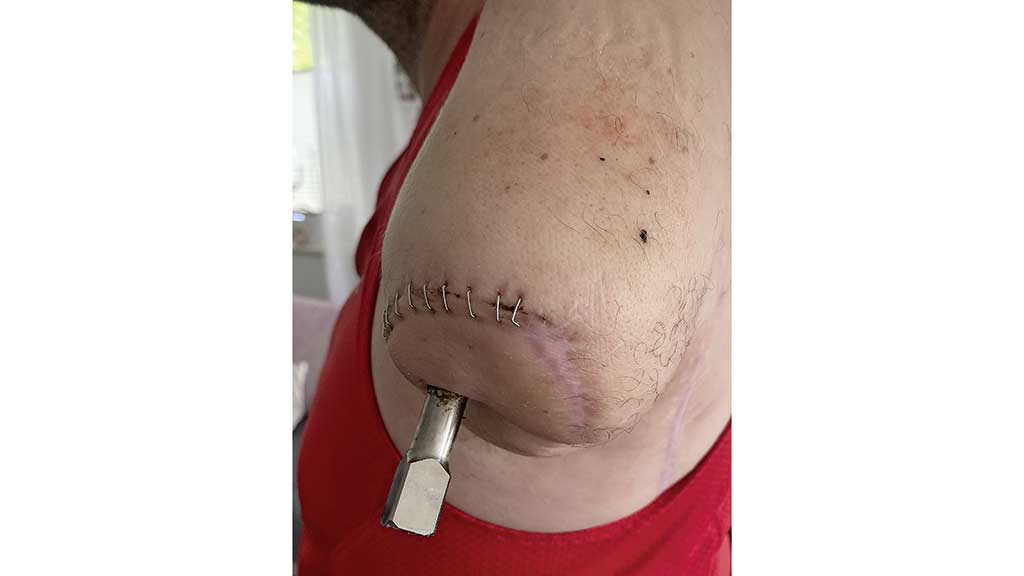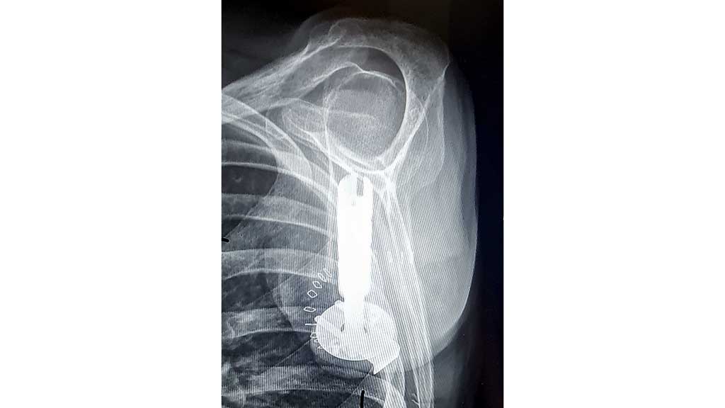 TMR-OP und Step 1 (Abb. 4) der Osseointegration erfolgten am 27.01.2021 in der Universitätsmedizin Göttingen 8. Nach einer Einwachsphase der Fixierung im Humerus und einer Abheilung nach der TMR-OP erfolgte am 23.06.2021 Step 2 der Osseointegration mit der Einbringung des Implantates (Abb. 5) zur späteren Aufnahme für die Prothese, ebenfalls in Göttingen durch das Team aus der Universitätsmedizin Göttingen von der Klinik für Unfallchirurgie, Orthopädie und Plastische Chirurgie, bestehend aus Prof. Dr. med. Frank Braatz, Prof. Dr. med. Gunther Felmerer und Dr. med. Jennifer Ernst sowie mit Unterstützung durch Prof. Rickard Brånemark von der Universität Göteborg in Schweden. Für die Versorgung wurde wie oben erläutert das „OPRA™ Implant System“ von Integrum verwendet.