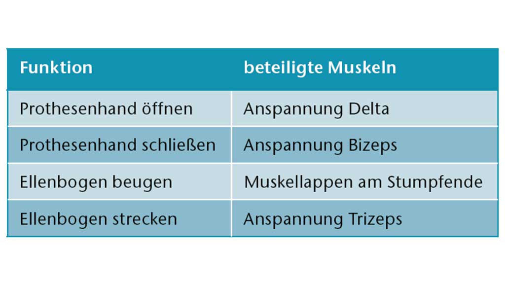 Dabei wurde das Prothesensystem neben dem Patienten so aufgebaut, dass der „DynamicArm plus“ auf gleicher Höhe angebracht war wie sein erhaltener Arm. Schritt für Schritt wurde die Ansteuerung so trainiert und angepasst, bis 4 Signalpunkte angesteuert werden konnten. Wichtig war allen Beteiligten, dass der Patient seinen Phantombewegungen, die er aus dem Kopf abrufen konnte, erhält und somit intuitiv zur Ansteuerung nutzt. Phantombewegungen nennt man die vom Patienten im Gehirn noch nachvollziehbaren Bewegungen der nicht mehr vorhandenen Gliedmaße. Durch das Training verbesserte sich dieses Bewegungsmuster deutlich. Die in Tabelle 1 wiedergegebene Matrix dokumentiert das Ergebnis der TMR-Operation.