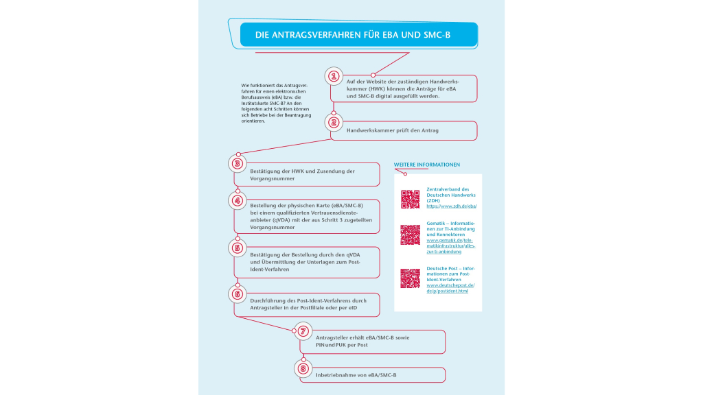 Die Beantragung der SMC‑B erfolgt wie beim eBA über die Handwerkskammern. Voraussetzung für die Beantragung ist ein bereits gültiger eBA, der im beantragenden Betrieb vorhanden ist. Die notwendige PIN wird separat zur Karte per Post verschickt.