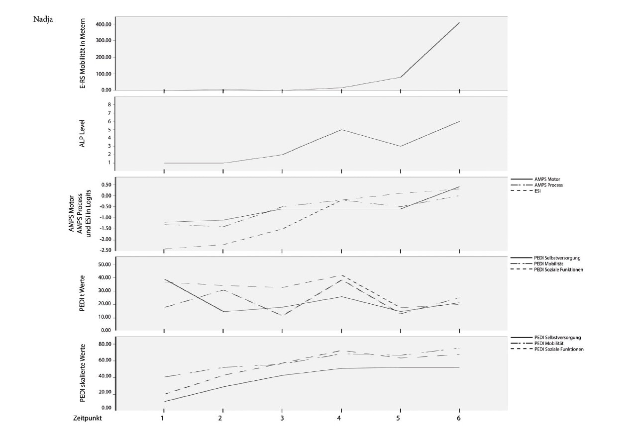 Nadja ist ein Mädchen mit einer spastischen einseitigen ZP, das zu Beginn der Studie 2,3 Jahre alt war. Sie lebt bei ihren Eltern und ihrer Schwester und steht in engem Kontakt mit ihren Großeltern. Obwohl sie gehen kann, genießt sie es, mit dem E‑RS zu fahren. Ihre Eltern beschreiben, wie dies ihr Selbstvertrauen und ihren Sinn für die Bewältigung der ADL-Aufgaben stärkt. Von der Erstuntersuchung bis t6 machte Nadja einen klinisch relevanten Fortschritt bei der Fahrstrecke in Metern/Sitzung, in den ALP-Phasen, im AMPS, d. h. in der Ausführungsqualität von ADL-Aufgaben, im ESI, d. h. bezüglich ihrer sozialen Interaktionsfertigkeiten, im PEDI-t-Wert Mobilität und Selbstversorgung sowie in den PEDI-skalierten Werten Selbstversorgung, Mobilität und soziale Funktionen. Keine Fortschritte erzielte sie dagegen beim t‑Wert der sozialen Funktion des PEDI (Abb. 2 u. Tab. 2).