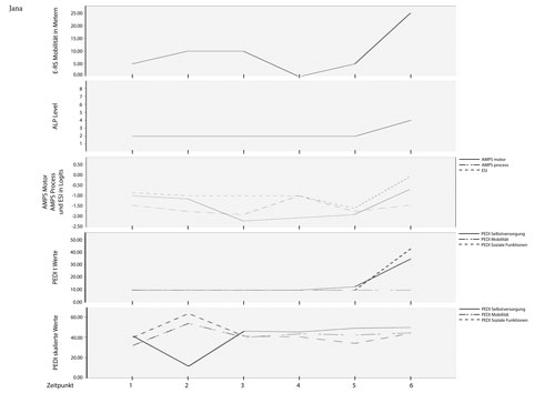 Jana ist ein Mädchen mit einer ataktischen ZP, das zu Beginn der Studie 4,0 Jahre alt war. Sie lebt mit ihren Eltern und zwei Geschwistern und begann während der Studie mit dem Kindergarten. Jana hat einen manuellen Rollstuhl und hat begonnen, mit einer Gehhilfe zu gehen. Zu Hause benutzt sie keine Gehhilfen, da sie es vorzieht, von einem Ort zum anderen zu kriechen. Sie benutzt den E‑RS gerne für eine kurze Zeit, verliert jedoch schnell das Interesse. Von der Erstuntersuchung bis t6 machte Jana klinisch relevante Fortschritte in den ALP-Phasen, im AMPS, d. h. in der Ausführungsqualität von ADL-Aufgaben, im ESI, d. h. bezüglich ihrer sozialen Interaktionsfertigkeiten, in den PEDI-t-Werten Selbstversorgung und soziale Funktionen und im PEDI-skalierten Wert soziale Funktionen. Keine klinisch relevanten Fortschritte erzielte Jana dagegen bei der Fahrstrecke in Metern/Sitzung, im PEDI-t-Wert Mobilität und bei den skalierten Werten Selbstversorgung und Mobilität (Abb. 3 u. Tab. 2).