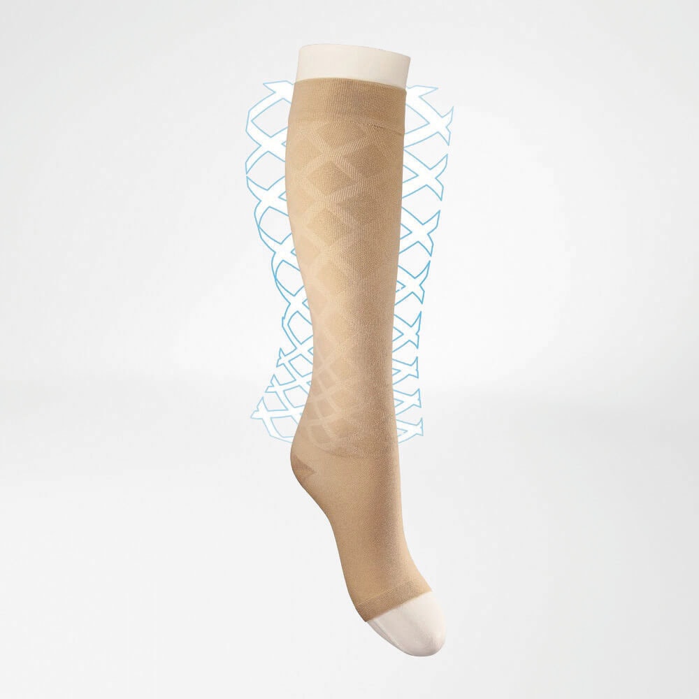 Das Wich­tigs­te zu die­ser Fra­ge zuerst: Befun­de sind ent­schei­den­der als Dia­gno­sen. Eine fes­te Zuord­nung bestimm­ter Dia­gno­sen, die mit Flachstrick­strümp­fen behan­delt wer­den müss­ten, gibt es nach die­ser Leit­li­nie nicht. Flachstrick­strümp­fe (Abb. 3) zeich­nen sich durch fol­gen­de Eigen­schaf­ten aus: