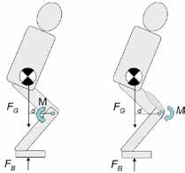 Mittels instrumenteller 3‑D-Bewegungsanalysen ist es möglich, Bewegungen über räumliche und zeitliche Erfassung von Markerkugeln an einem Probanden zu quantifizieren. Im Boden eingelassene Kraftmessplatten messen die Bodenreaktionskräfte unter dem Fuß des Probanden in drei Raumrichtungen. Über ein zugrunde liegendes biomechanisches Modell 9 10 lassen sich aus diesen Informationen sowohl die Bewegung der Gelenke (Kinematik) als auch extern wirkende Gelenkdrehmomente (Kinetik) berechnen. Sind die externen Gelenkdrehmomente bekannt, lässt sich auf die internen von der Muskulatur gegenhaltenden Gelenkdrehmomente schließen (Abb. 1). Die Aufnahmen der Markerbewegung erfolgen über ein 12-Kamera-System (Vicon Motion Systems Ltd., Oxford, Großbritannien). Bodenreaktionskräfte werden mittels dreier Kraftmessplatten erfasst (Kistler, Ostfildern, Deutschland).