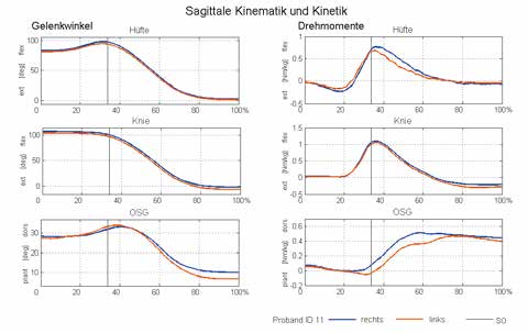 Aus den zehn Aufstehvorgängen wird pro Proband von Beginn der Aufstehbewegung bis zum Erreichen des aufrechten Stands eine mittlere Kinematik und Kinetik der unteren Extremitäten bestimmt und für die Sagittalebene als Zeitreihen dargestellt. Das maximale Kniedrehmoment wird für jeden Durchgang bestimmt.