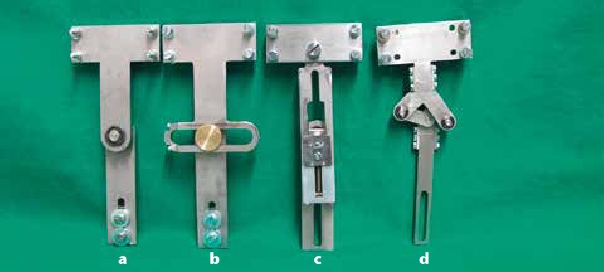 Das Gelenk mit Gleitführung (b) besteht aus einem einfachen Scharniergelenk, das in einem Langloch in 90° zur Oberschenkellängsachse auf dem proximalen Gelenkanteil läuft. Für die Federschlittenkonstruktion © verläuft ein Scharniergelenk in einem Langloch parallel zur Oberschenkellängsachse. Damit Ober- und Unterhülse nicht durch ihr Eigengewicht aufeinander zurutschen, kompensiert eine Feder im distalen Anteil das Eigengewicht und erlaubt bei auftretenden Scherkräften eine Verschiebung der Drehachse. Die Vierergelenkkette (d) bildet über die Relation der einzelnen Schenkellängen den Verlauf einer momentanen Kniedrehachse nach (Abb. 6).