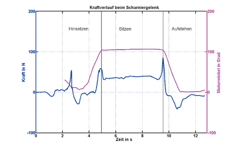 Die aktive Unterstützung erfolgt analog der Servolenkung im Auto. Mit einem biomechanischen Modell, erstellt in der Arbeitsgruppe Regelungstechnik, wird aus den sensorisch erfassten Winkel- und Kraftdaten zeitgenau das vom Nutzer aufgebrachte Kniemoment berechnet. Multipliziert mit einem Verstärkungsfaktor ergibt sich das durch die Antriebe zugeschaltete Unterstützungsmoment. Als Verstärkungsfaktor wurden zunächst 30 % festgelegt, angelehnt an den in der Literatur beschriebenen Kraftverlust von ca. 30 % im Zuge des Alterungsprozesses 12.