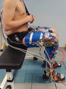 Um den Unterstützungseffekt der aktiven Orthese auf den Nutzer zu beurteilen, wird die Muskelaktivität des M. rectus femoris während des Prototypentests mit Probanden aufgezeichnet (EMG-System, Biovision, Wehrheim, Deutschland) (Abb. 8). Es wird angenommen, dass die Unterstützung durch die Orthese eine Reduzierung der maximalen Muskelaktivität zur Folge hat.