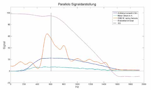 Zeitsynchron werden Drehmoment, Strom und Motorwinkel des Antriebs aufgezeichnet. So lassen sich die Daten der Bewegungsanalyse und der Muskelaktivität in Bezug zu den Motordaten begutachten. Die Probanden standen jeweils zehn Mal mit Unterstützung des Motors und mit zu null geregeltem Drehmoment auf. Die maximale Muskelaktivität im gefilterten und rektifizierten EMG-Signal wird im Zeitfenster um den SO betrachtet und zwischen der unterstützten und der 0‑Moment-Kondition verglichen.