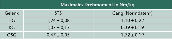 Das Drehmoment verändert sich bereits vor dem SO und erreicht im Hüftgelenk zum SO das Maximum. Im Knie- und Hüftgelenk wird das maximale Drehmoment kurz nach dem SO erreicht (Abb.3). Für das maximale Kniedrehmoment beim Aufstehen aus dem Sitzen ergibt sich über die gesamte Referenzgruppe ein Mittelwert von 1,07 Nm/kg ± 0,12 Nm/kg.