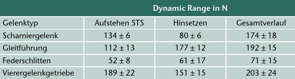 Zur Auswertung der Scherkraftmessung wird der Dynamikumfang (DR), also der Abstand zwischen Minimum und Maximum, der Kraftmessung bei den STS-Bewegungen betrachtet (siehe Abb. 7). Am Kraftverlauf sind die einzelnen Bewegungsphasen zu erkennen. Die gemittelten Kräfte aus dem Test betragen beim Hinsetzen maximal 177 N ± 12 N und minimal 61 N ± 17 N (Tab. 2). Die geringsten Scherkräfte ergeben sich mit der Federschlittenkonstruktion mit 52 N ± 8 N beim Aufstehen und 61 N ± 17 N beim Hinsetzen. Aufgrund der verringerten Scherkraft lässt sich auf eine verringerte Relativbewegung zwischen orthetischer und anatomischer Achse bei dieser Gelenkkonstruktion schließen.
