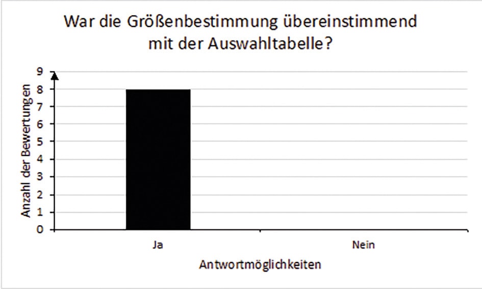 In der Testphase zeigte sich zunächst, dass die Orthese eine geeignete Größenauswahl erlaubt: Die drei auswählbaren Orthesengrößen ermöglichten bei allen Patienten eine adäquate Versorgung mit der Orthese. Die zugrunde gelegten Auswahlkriterien der Tabelle zur Größenbestimmung verwiesen bei allen Patienten auf die richtige Orthesengröße, mit der sie schlussendlich auch versorgt wurden. Eine Nachpassung der Orthese durch thermoplastische Verformung oder Zuschliff des Orthesenverlaufs war bei keinem Patienten notwendig.