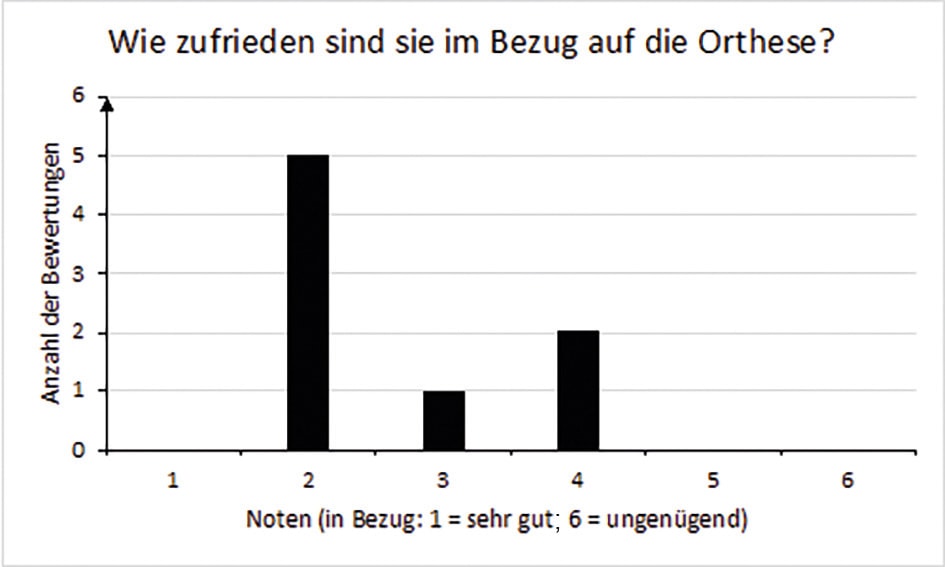 Anhand der Fragebögen war grundsätzlich ersichtlich, dass die Patientenzufriedenheit positiv ausfiel und eine klare Tendenz in Richtung zur Benotung „gut“ zeigt (Abb. 5). Dabei ist allerdings darauf hinzuweisen, dass eine Korrelation zwischen der Patientenzufriedenheit und dem Therapieerfolg besteht: Sofern der Therapieerfolg durch den Techniker schlechter bewertet wurde, war auch die Patientenzufriedenheit geringer. Aus den Kommentaren zu den Fragebögen konnte darauf geschlossen werden, dass schlechte Bewertungen in den genannten Bereichen mit einer geringen Orthesenakzeptanz und reduzierten Tragezeiten einhergingen.