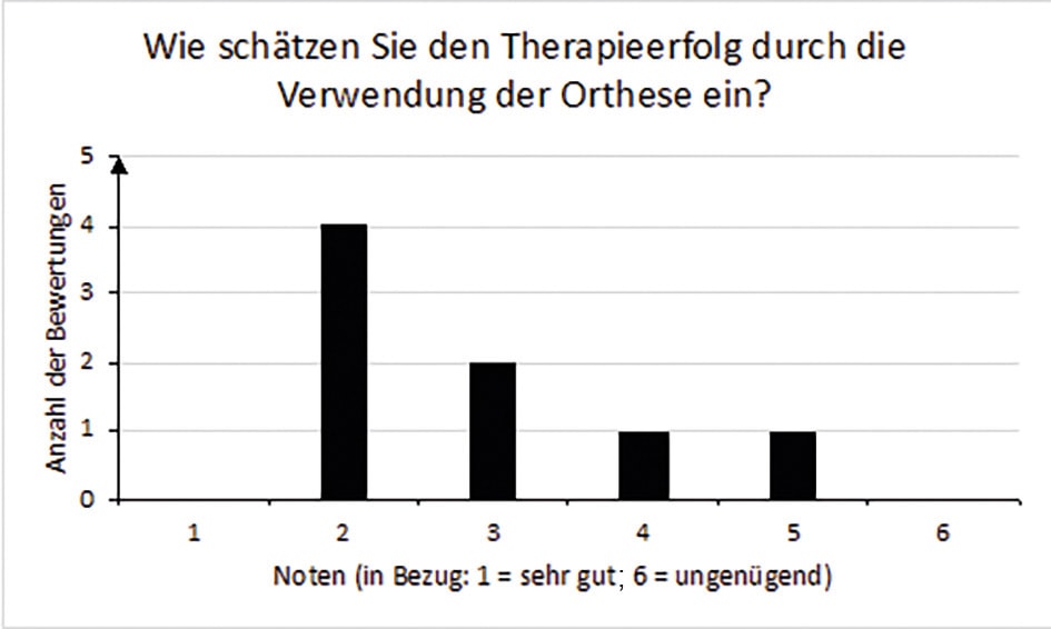 Der Therapieerfolg ist grundsätzlich objektiv entsprechend dem Verwendungszweck der Orthese zu betrachten. Dabei ging es einerseits darum, über das tägliche Tragen der Orthese postoperativ eine Restkontraktur aufzubiegen, andererseits darum, im Rahmen der ergotherapeutischen Behandlung die Koordination und die Kraft der Hand zu schulen und zu verbessern. Aus den Fragebögen und den Kommentaren der Versorger bei der Auswertung ging hervor, dass die Orthese in drei Fällen auch als Übungsorthese zum Einsatz kam. Hier sind die Fragebögen differenziert zu betrachten: In den drei Fällen der Übungsorthese wurden die Noten „Zwei“, „Drei“ und „Vier“ vergeben. Die Noten „Zwei“ und „Drei“ weisen hierbei auf einen positiven Therapieverlauf hin. Die Note „Vier“ wurde vergeben, da sich bei dem Anwender nur ein sehr geringer Fortschritt im Zuge der ergotherapeutischen Behandlung bei Benutzung der Orthese einstellte. In den Fällen, in denen die Orthese als dynamische Extensionsorthese im Alltag verwendet wurde und ihren Hauptnutzen in der Redression hatte, ist die Resonanz mit „gut“ zu bewerten. Allerdings ist ein negativer Ausreißer zu bekunden: Im entsprechenden Fall wies der Anwender nur eine geringe Orthesenakzeptanz auf und war nicht gewillt, die Orthese zu tragen. Entsprechend konnte sich kein Therapieerfolg einstellen.