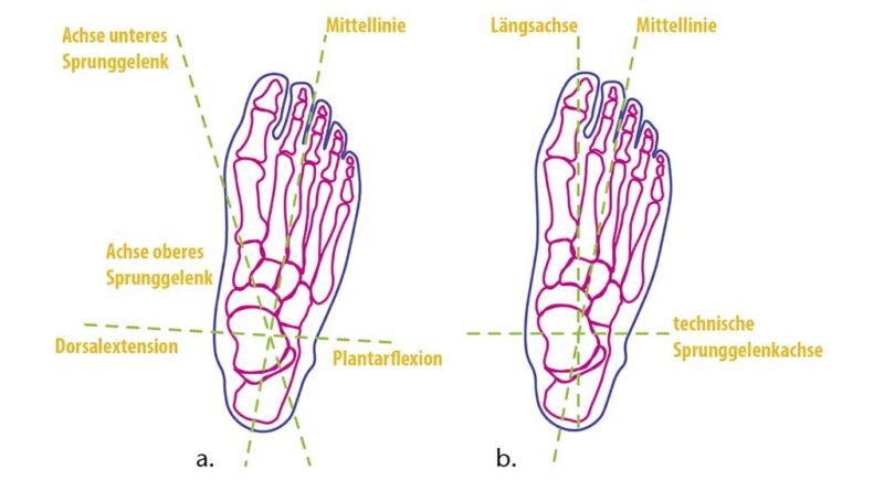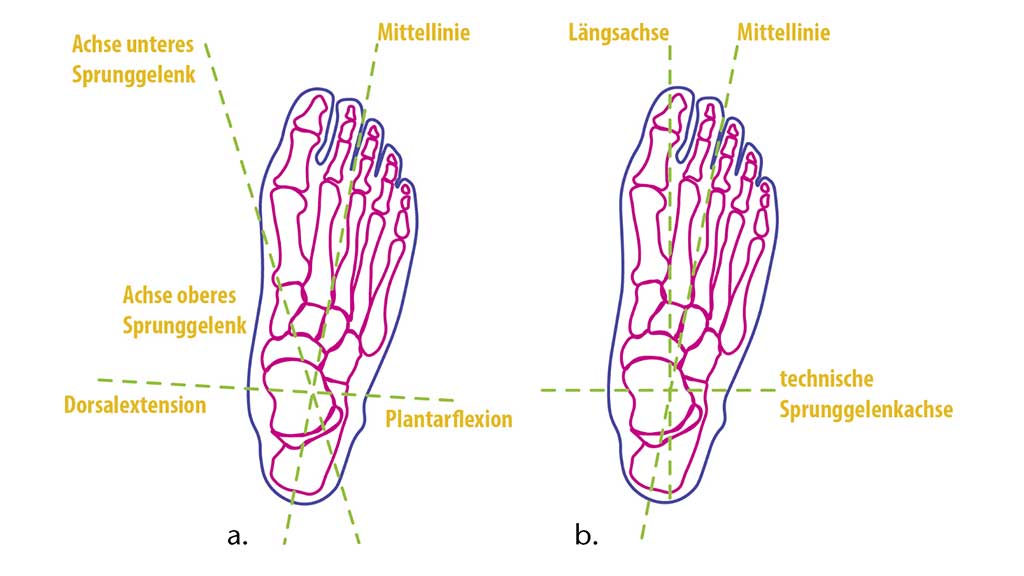 Das OSG und das USG erlau­ben Bewe­gung in zwei unter­schied­li­chen ana­to­mi­schen Ach­sen sowie zusam­men­ge­setz­te Bewe­gun­gen durch die struk­tu­rel­le Anord­nung der Kno­chen im Mit­tel­fuß. Die Kine­ma­tik des Fußes wird wesent­lich durch das OSG und das USG bestimmt. Der Talus hat hier eine beson­de­re Posi­ti­on, weil er an bei­den Gelen­ken betei­ligt ist und kei­nen eige­nen Mus­kel­an­satz auf­weist. Die Mus­keln über­span­nen den Talus, wes­halb die ein­wir­ken­den Kräf­te mus­ku­lär kom­pen­siert wer­den müs­sen. Zudem kreu­zen sich bei­de Ach­sen im Sinus Tar­si, was die gekop­pel­te Funk­tio­na­li­tät im Sin­ne eines aty­pi­schen Kar­dan-Gelen­kes beschreibt6.