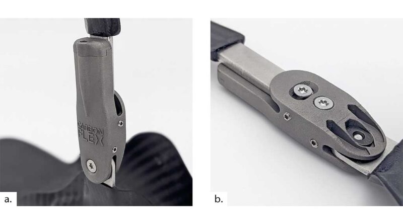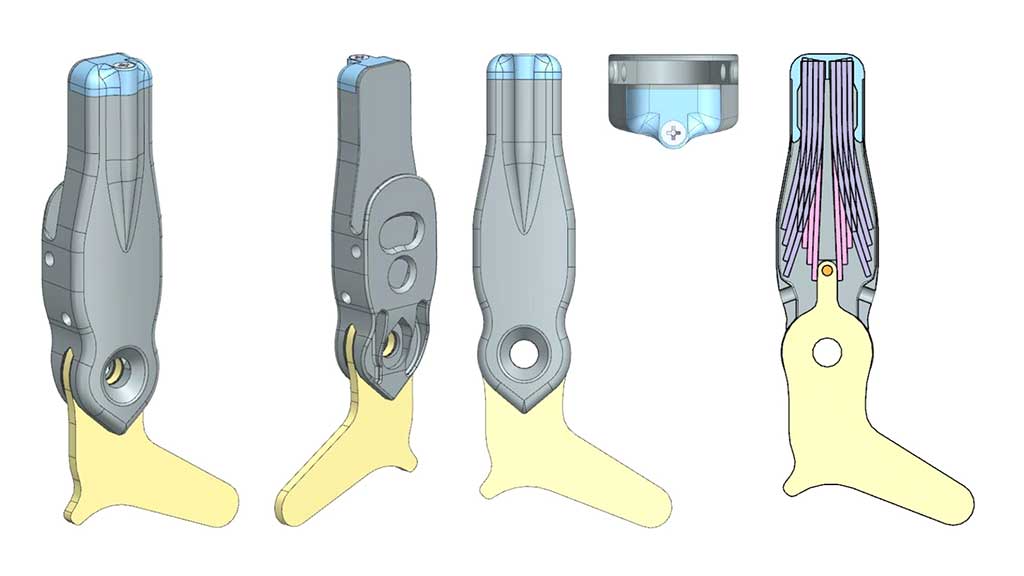 Das neu ent­wi­ckel­te Car­bon­Flex-Orthe­sen­ge­lenk zeich­net sich durch eine mode­ra­te Bau­teil­grö­ße, eine gerin­ge Mas­se, ein ein­fa­ches Kon­struk­ti­ons­prin­zip und har­mo­ni­sche Eigen­schaf­ten der ein­ge­setz­ten Blatt­fe­der­tech­no­lo­gie aus. Es lässt sich pro­blem­los in den meis­ten kon­fek­tio­nier­ten Schu­hen tra­gen. Das Kon­struk­ti­ons­prin­zip bie­tet ein hohes Poten­zi­al zur Ent­wick­lung unter­schied­li­cher Gelenk­grö­ßen, Vari­an­ten mit ver­schie­de­nen Rück­stell­kräf­ten und was­ser­fes­ter Bauteilgruppen.
