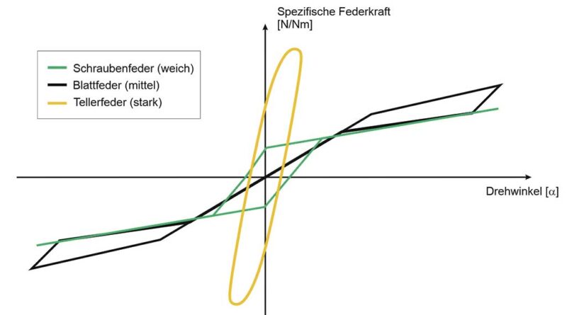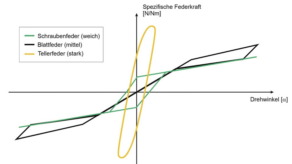 Ein bemer­kens­wer­ter Unter­schied der unter­such­ten Gelenk­ty­pen ist jedoch, dass die Vari­an­ten mit Blatt­fe­dern eine glo­ba­le Hys­te­re­se auf­wei­sen. Eine weni­ger aus­ge­präg­te, aber dafür um die Null­stel­lung des Gelenks her­um auf­tre­ten­de Hys­te­re­se kann bei Gelenk­ty­pen mit Spi­ral­fe­dern beob­ach­tet wer­den. Dafür ver­hal­ten sich die­se bei grö­ße­ren Aus­len­kun­gen line­ar bzw. mit einer nur gerin­gen Hys­te­re­se. Im Gegen­satz hier­zu zeigt das Car­bon­Flex-Sys­tem­ge­lenk mit Blatt­fe­dern gera­de beim Null­durch­gang ein vor­ran­gig linea­res Ver­hal­ten und neigt erst bei grö­ße­ren Aus­len­kun­gen zu einem nicht­li­nea­ren Ver­hal­ten in Ver­bin­dung mit einer Energiedissipation.