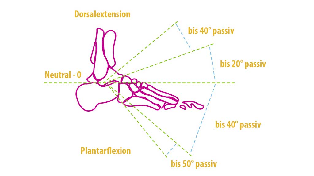 Wie in Abbil­dung 2 nach Hoh­mann und Uhl­ig2 zu erken­nen, wird zwi­schen akti­ver (Eigen­kraft) und pas­si­ver (Fremd­kraft) Ran­ge of Moti­on unter­schie­den. Laut der Neu­tral-Null-Metho­de besteht eine akti­ve Beweg­lich­keit von 20–0‑40, wel­che im Gang nicht voll­um­fäng­lich genutzt wird. Im nor­ma­len Gang­zy­klus wer­den ca. 10° Dor­sal­ex­ten­si­on und 15° Plant­ar­fle­xi­on benö­tigt3.