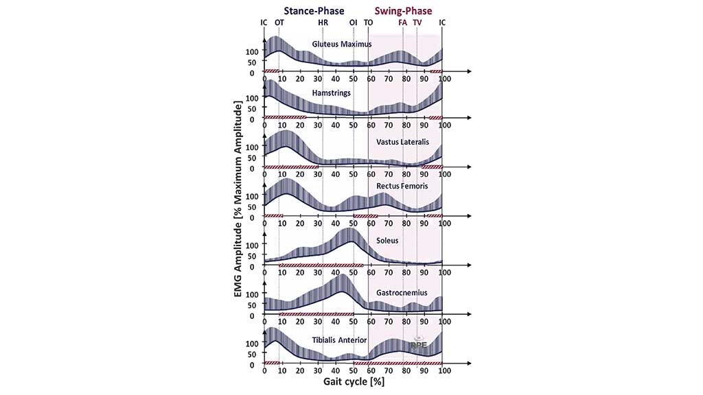 Rele­van­te Mus­kel­ak­ti­vi­tä­ten im mensch­li­chen Gangzyklus