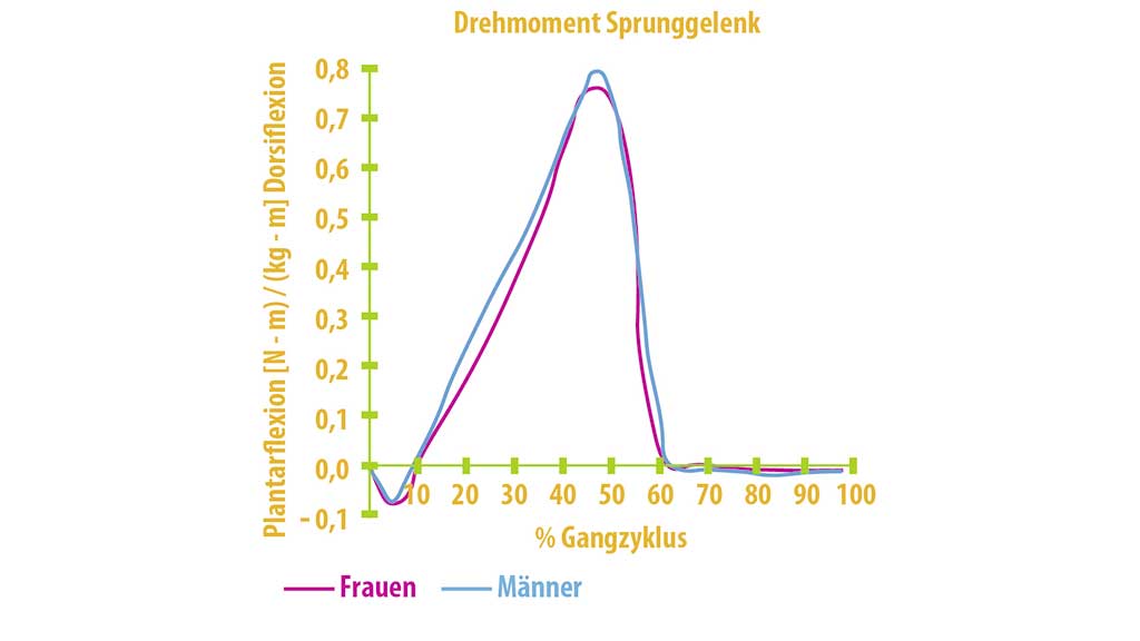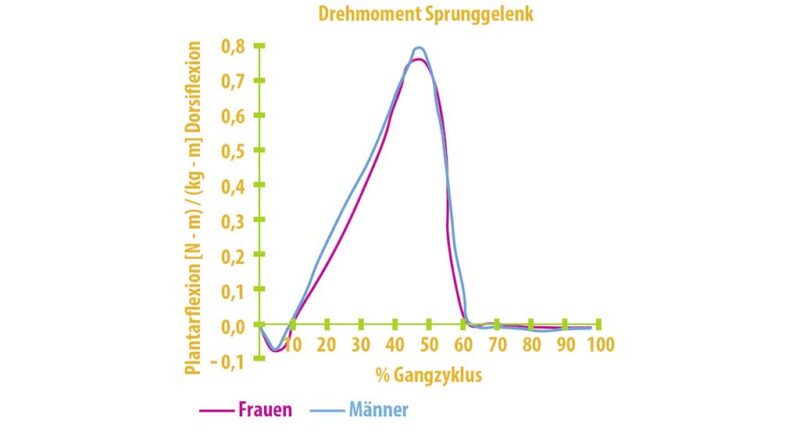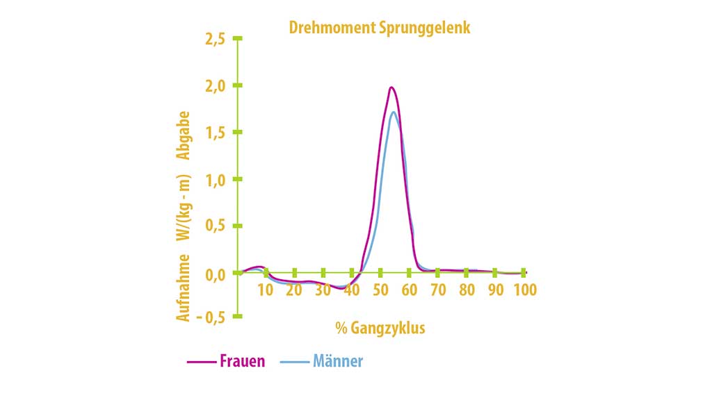 Als Bei­spiel wird die Dor­sal­ex­ten­si­on des OSG in Mid stance/Terminal stance durch äuße­re Boden­re­ak­ti­ons­kräf­te ein­ge­lei­tet. Die stärks­ten Momen­te im OSG ent­ste­hen vor dem soge­nann­ten Push-off in der ter­mi­na­len Stand­pha­se (Abb. 6). Dem ent­ge­gen ste­hen die kom­pen­sa­to­ri­schen Kräf­te der Unter­schen­kel­mus­ku­la­tur (Mus­kel­kon­trak­ti­on), wel­che in dem Leis­tungs­dia­gramm (Abb. 7) dar­ge­stellt wer­den. Hier wird ersicht­lich, dass ein ent­spre­chen­des Dreh­mo­ment immer eine ant­ago­nis­ti­sche Gegen­kraft benö­tigt, um das nöti­ge Kräf­te­gleich­ge­wicht wiederherzustellen.