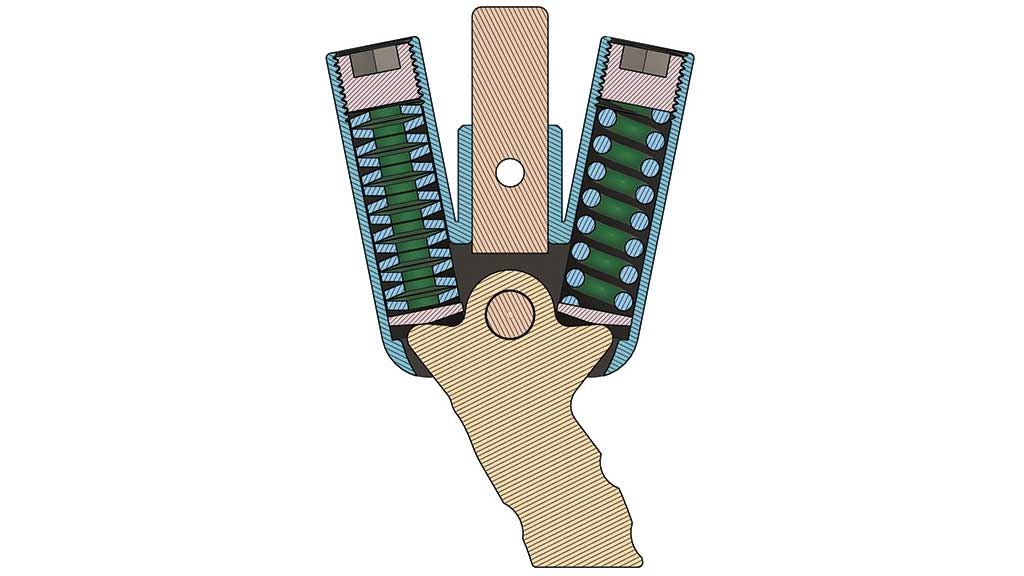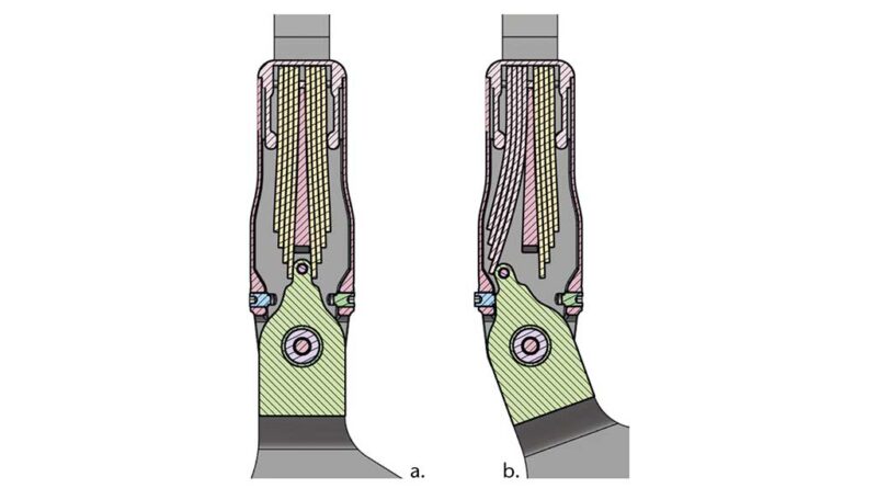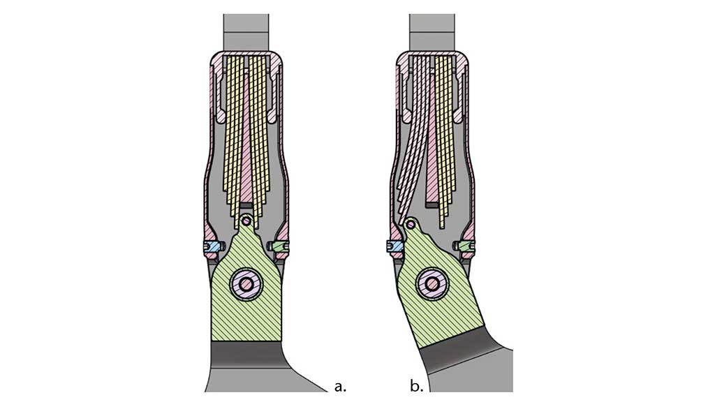 Durch die Anord­nung der Blatt­fe­dern im Ver­lauf der Sys­tem­schie­nen kann das Gelenk deut­lich schma­ler gestal­tet wer­den. Die Vor­span­nung der Feder­sta­pel sorgt zudem für einen har­mo­ni­schen Über­gang in der Be- und Ent­las­tungs­pha­se des Gan­ges, was zusätz­lich zu einer Redu­zie­rung der Geräusch­ent­wick­lung führt. In Abbil­dung 9 sind Schnitt­an­sich­ten des CF-Gelenks für zwei unter­schied­li­che Aus­len­kun­gen dargestellt.