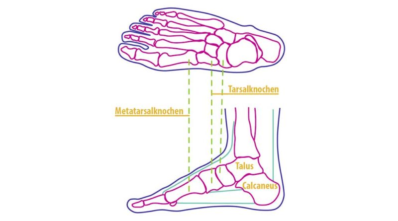 Im bio­me­cha­ni­schen Sin­ne hat der Fuß vie­le Auf­ga­ben zu bewäl­ti­gen und gewähr­leis­tet die Last­über­nah­me des viel­fa­chen Kör­per­ge­wich­tes. Der Fuß über­trägt zudem die Kräf­te, die neben der Gleich­ge­wichts­re­gu­lie­rung auch der Fort­be­we­gung die­nen. Um die viel­fäl­ti­gen Anfor­de­run­gen zu erfül­len, hat der Fuß eine kom­ple­xe knö­cher­ne, mus­ku­lä­re und liga­men­tä­re Struk­tur (Abb. 3). Die­se erlaubt es, dass der Fuß je nach Bedarf sei­ne Stel­lung, sei­ne Form und sei­ne Stei­fig­keit ver­än­dert. Die Anord­nung der Fuß­kno­chen bil­det eine cha­rak­te­ris­ti­sche längs­ge­wölb­te Form. Das Quer­ge­wöl­be wird durch die Mit­tel­fuß­kno­chen gebil­det, wel­ches durch mus­ku­lä­re und fas­zia­le Ver­span­nun­gen ent­steht. Die­ses dient pri­mär zur Erzeu­gung der erfor­der­li­chen Stei­fig­keit des Vor­fu­ßes in der Abstoß­pha­se5.