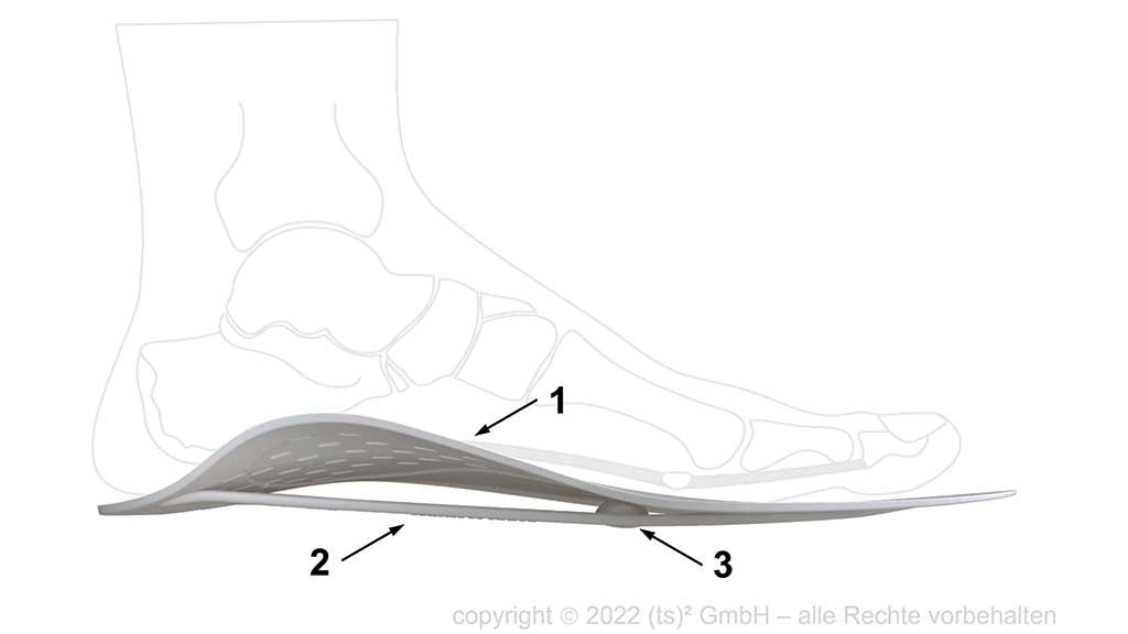 Die Entwicklungsziele der 3D-gedruckten bionischen Fußorthese konnten unter anderem durch den Einsatz moderner Konstruktionsverfahren und additiver Fertigung umgesetzt werden. Durch die zum Patent angemeldete Einlage kann erstmals der Windlass-Mechanismus unterstützt oder ersetzt werden. Diese positive und dynamische Unterstützung der Fußfunktion wurde für Läuferinnen und Läufer mit funktionellem Knick-Senkfuß in einer wissenschaftlichen Studie nachgewiesen.