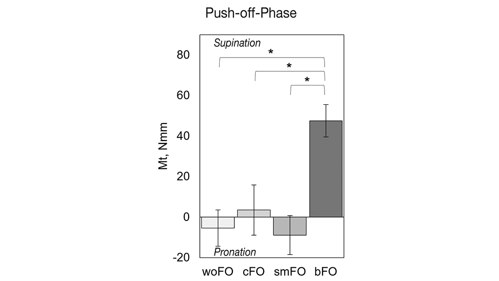 Folgende Belastungen wurden ermittelt (Abb. 5): Während der Push-off-Phase tritt ohne Versorgung eine maximale Supinationsbelastung von 5,42 ± 8,94 Nmm auf (negative Vorzeichen stellen gegenläufige Belastungen dar, was in dieser Phase eine Pronation bedeutet). Mit stützenden Einlagen beträgt die maximale Belastung während des Push-offs 3,48 ± 12,38 Nmm, mit den sensomotorischen Orthesen ‑8,87 ± 9,62 Nmm. Mit der 3D-gedruckten bionischen Fußorthese liegt die Pronationsbelastung bei 47,56 ± 7,96 Nmm. Die Ergebnisse zeigen, dass sich die Rückfußbelastung während der Push-off-Phase beim Laufen mit der bionischen Fußorthese signifikant von allen anderen Bedingungen unterscheidet.