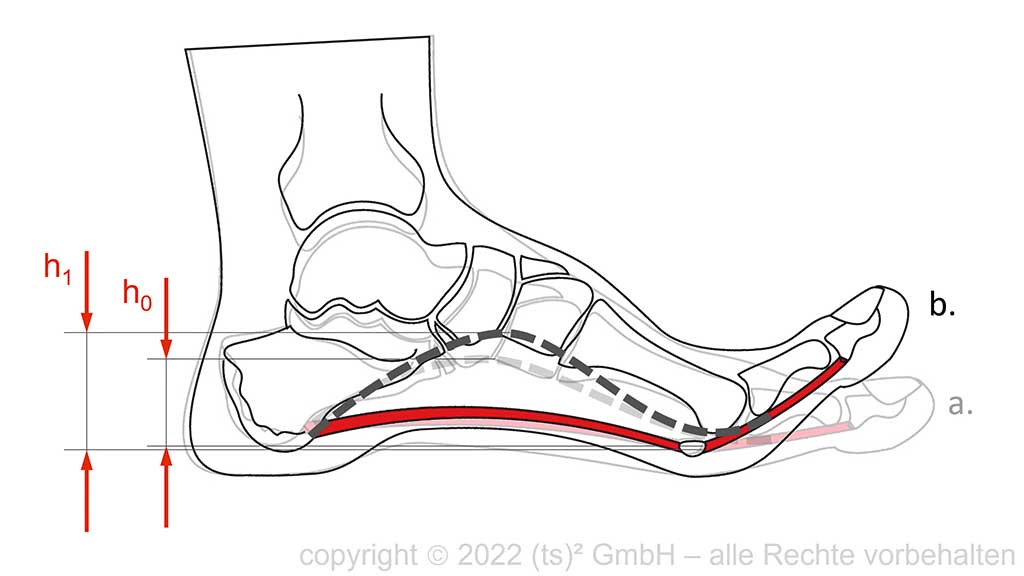 Werden die Zehen aus der Neutralstellung dorsalextendiert, steigt die Spannung in der Plantaraponeurose und in den Sehnen der Plantarflexoren an. Dieser Spannungsanstieg resultiert aus der Dorsalextension und dem Verlauf der bandhaften und sehnigen Strukturen des Fußes – vom Rückfuß bis in den Vorfuß und plantar der Drehpunkte der Metatarsophalangealgelenke (MTP-Gelenke) (Abb. 1a u. b). Aufgrund der wachsenden Spannung wird vor allem der mediale Mittel- und Rückfußbereich bogenförmig aufgerichtet und supiniert. Durch diese Aufrichtung und Supination sowie aufgrund der Gestaltung der gelenkigen Verbindungen des Mittel- und Rückfußes verriegeln die einzelnen Segmente und bilden eine rigide Einheit. Durch die steigende Spannung und Dehnung sowie durch die veränderte, aufgebogene Fußstellung kann unter anderem in den bandhaften Strukturen und im Muskel-Sehnen-Komplex Verformungsenergie gespeichert werden 8 9 10.