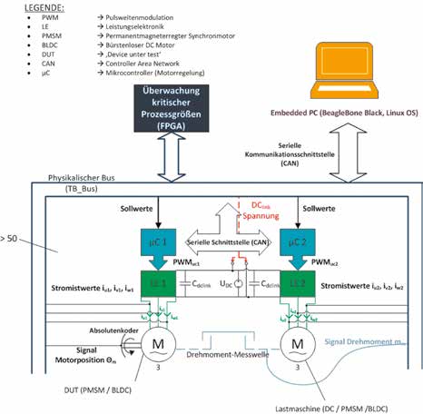 Die einzelnen Prothesen-Komponenten müssen separat als Module und im Verbund als System verifiziert werden. Für die Verifikation der elektrischen Maschine(n) werden Prüfstände benötigt. Diese bestehen in der Regel aus zwei Motoren (DUT, „Device under test”, und Lastmaschine), Drehmoment-Messwelle sowie Drehzahl- und/oder Winkel-Geber (Inkrementalgeber/Absolutgeber) (Abb. 2). Wichtig ist hierbei die synchrone Regelung der Motoren. Dabei wird der Motor, welcher den Gangzyklus simuliert, drehmomentgeregelt, so dass das entsprechende zyklische Drehmoment realisiert wird. Der Motor für den Prothesenantrieb wird drehzahl- oder positionsgeregelt. Als Regeleinheit wird ein leistungsfähiger Mikrocontroller auf Basis eines ARM-Cortex M4 eingesetzt. Dieser bietet hohe Performance und sehr gute Möglichkeiten zur Anbindung von Sensorik und Kommunikation aufgrund hinreichender Ausstattung mit entsprechenden Schnittstellen. Zur Synchronisation, Datensammlung und ‑analyse soll ein Embedded Computer in Form des BeagleBone Black zum Einsatz kommen.