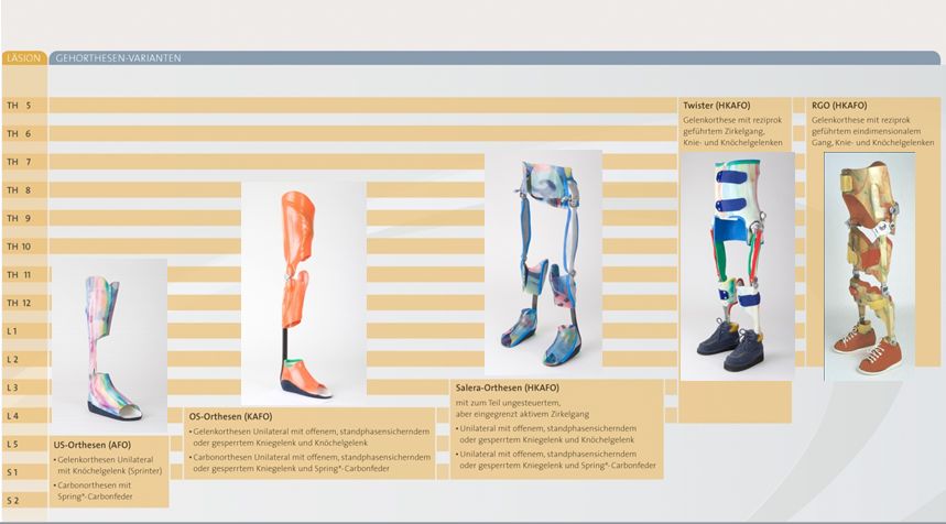 Bei Läsionshöhe L1 sowie bei Th12 — Th5 wird ohne orthetische Hilfsmittel kein freies Stehen und Gehen erreicht. Für die Hüftstreckung und den Seitenhalt ist eine zusätzliche Abstützung durch die oberen Extremitäten erforderlich. Für die seitliche und hüftstreckende Sitzhaltung ist die Zuhilfenahme der Arme nötig. Um ein sicheres Gehen und Stehen zu ermöglichen, muss über die Fußbettung haltungskontrollierend wie auch auf die Kondylen stützend eingewirkt und die Hüftgelenkbewegung in Flexion/Extension und Adduktion/Abduktion eingegrenzt werden.