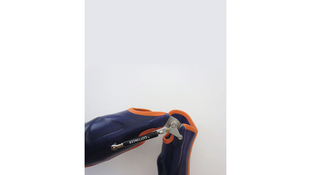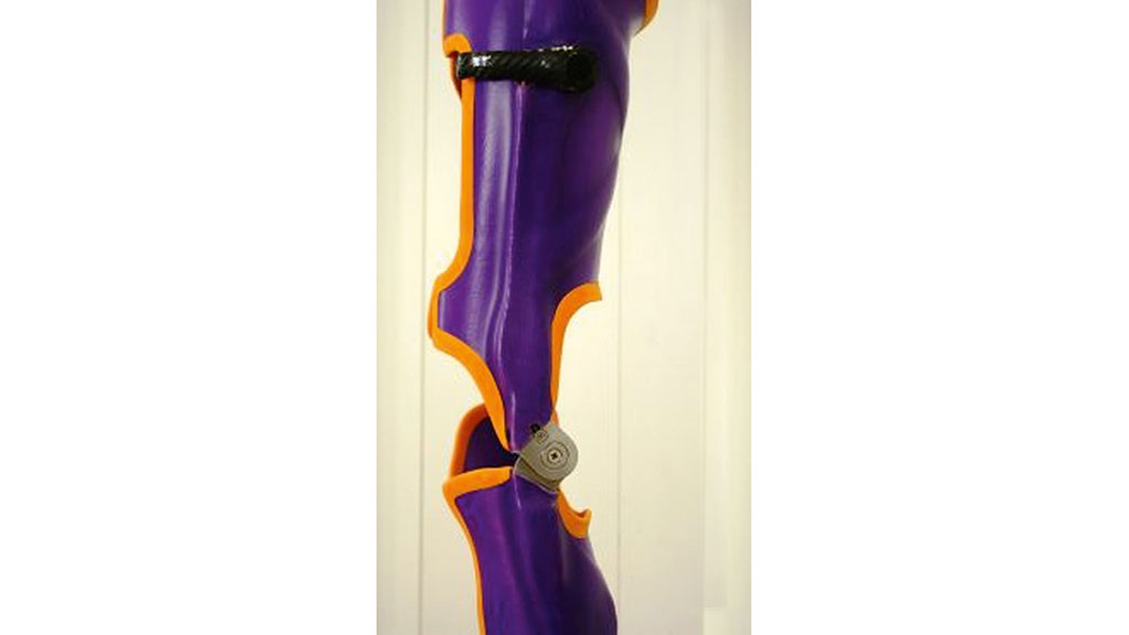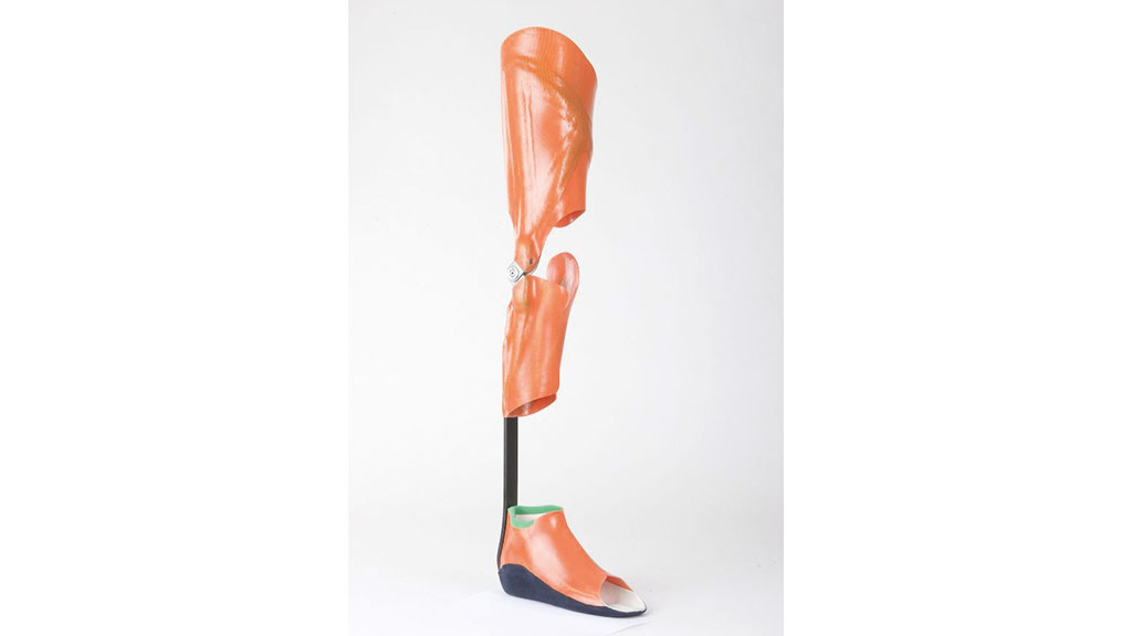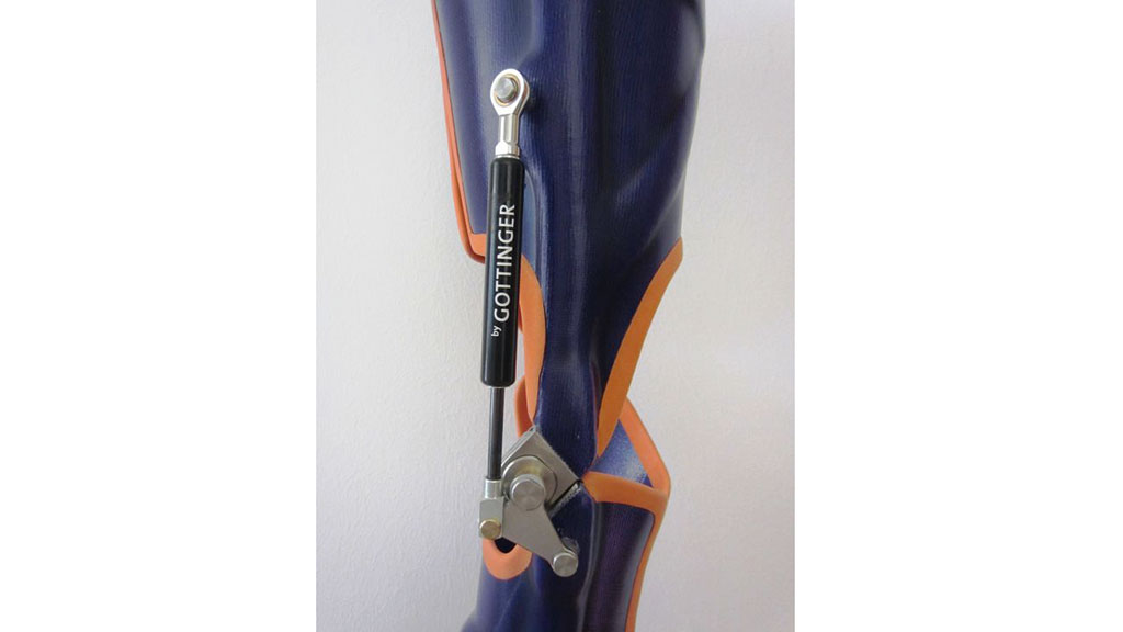 Als Knöchelgelenke können je nach Aktivität, vorhandener Kontrakturen und Muskelrestfunktionen konventionelle Knöchelgelenke oder die Spring®-Carbonfedern eingesetzt werden. Bei freigegebenem Bewegungsausschlag muss das Knöchelgelenk eine fußhebende Funktion im Übergang von Initial-swing zur Mid-swing besitzen. Bei ausreichender kniestreckender Muskulatur und einer Beugekontraktur unter 15° wird als Kniegelenk das freibewegliche Orthesengelenk Mono verwendet (Abb. 8). Dieses besitzt eine Rückverlagerung des Drehpunktes und unterstützt die fehlende kniestreckende Muskulatur, wodurch die Restkraft des M. quadriceps besser genutzt werden kann.