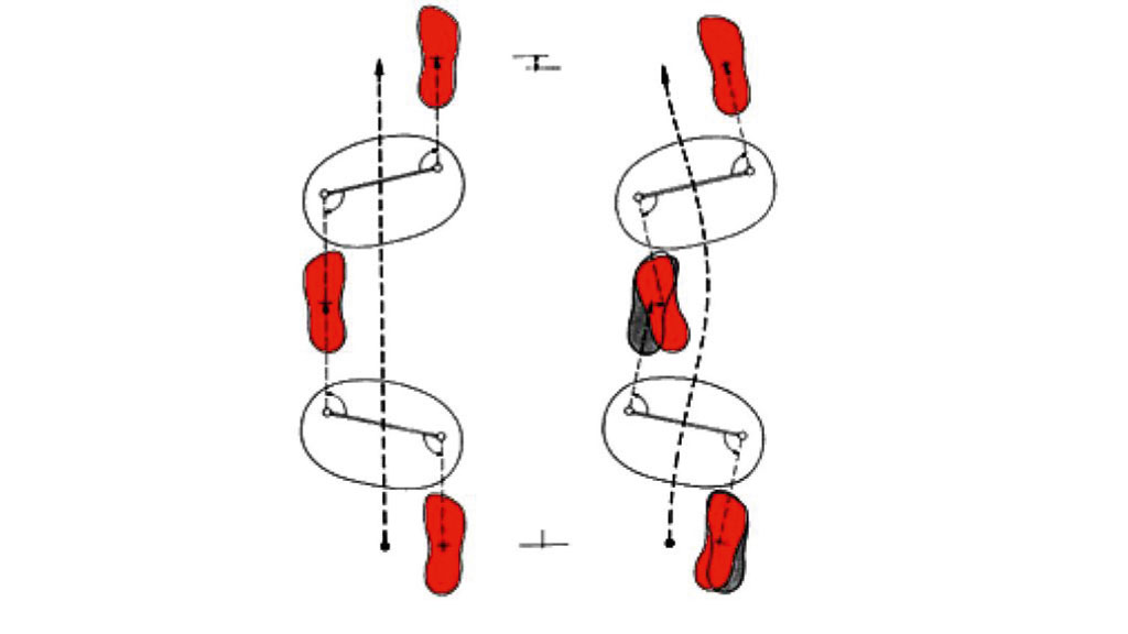 Ein 2‑D- oder 3‑D-Gelenk erlaubt im Schrittzyklus einen Zirkelgang, wobei zusammenfassend gesagt werden kann, dass durch die ermöglichte Beckenrotation eine Reduzierung der Rotation zwischen Boden und Orthesenschuhsohle erreicht sowie durch die Nutzung der Restmuskulatur zur Einleitung eines Schrittes der Energieaufwand beim Gehen vermindert werden kann (Abb. 17), was sich akzeptanzfördernd auf das Tragen der Orthese auswirkt. Zusätzliche Gehhilfen wie Rollator oder Gehstützen sind notwendig, um den Körperschwerpunkt zu verlagern.