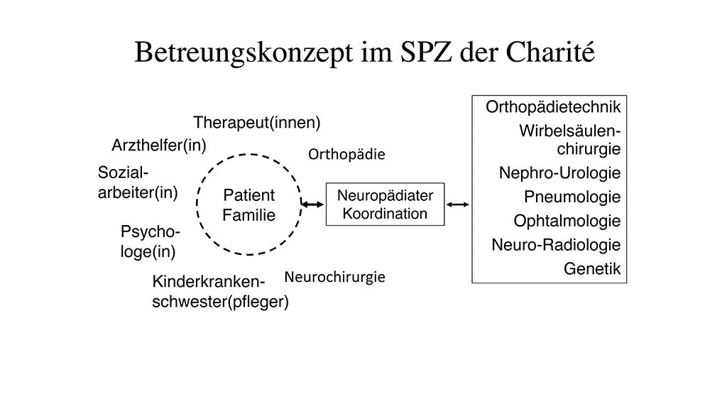 Die Betreuung von Patienten im SPZ wird nach der Vorstellung von Parsch und Schulitz von einem interdisziplinären Team durchgeführt [10]. Der Neuropädiater übernimmt als Arzt die Koordination zu den weiteren Fachrichtungen. Innerhalb des SPZ sind diese Fachrichtungen z. B. die Physiotherapie, die Psychologie oder die Orthopädie (Abb. 1). Innerhalb der Charité kann konsiliarisch auf weitere Fachgebiete zugegriffen werden wie z. B. die Wirbelsäulenchirurgie oder die Orthopädietechnik. Patienten mit Spina bifida wird so ein komplettes Behandlungsangebot in einer einzigen Einrichtung angeboten.