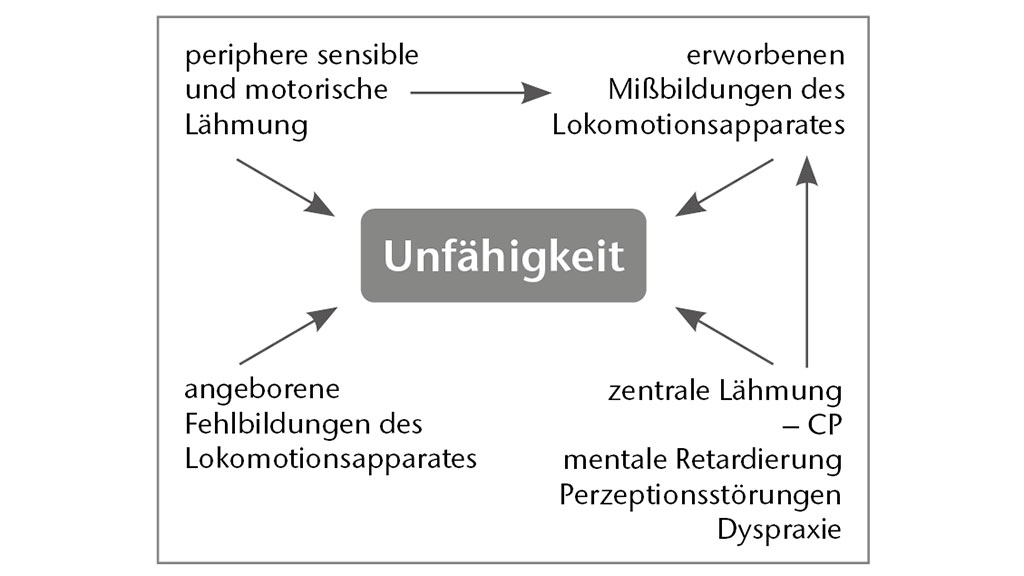 Das Berliner Konzept orientiert sich an den Arbeiten von Dr. Adriano Ferrari. Am Beginn steht hier die Analyse der Störung des Kindes (Abb. 2). Aus dieser Diagnose kann früh eine genaue Prognose für das Kind erarbeitet werden. Da die Folgen der peripheren Läsion für die motorische und körperliche Entwicklung des Kindes logisch und einfach abzuleiten sind, können bereits in den ersten sechs Lebensmonaten aus dem Bild der neurologischen Läsion und den primären Deformitäten die zu erwartenden Probleme genannt werden [5]. Den Eltern sollte Antwort auf folgende Fragen gegeben werden: