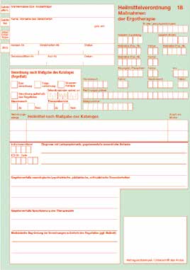 Soll die individuell angepasste Schiene über die gesetzliche Krankenversicherung abgerechnet werden, muss dem Ergotherapeuten eine entsprechende ärztliche Verordnung per Heilmittelverordnung Muster 18 vorliegen (Abb. 1). Ergotherapeutische Schienen besitzen keine Hilfsmittelnummern und sind nicht als Hilfsmittel im Hilfsmittelverzeichnis gelistet. Dennoch sind sie für den Patienten zuzahlungsfrei und belasten das Budget des verordnenden Arztes nicht (im Gegensatz zur Heilmittelbehandlung). Die Abrechnung erfolgt über eine von zwei Positionsnummern, entsprechend der Höhe der Kosten mit oder ohne Kostenvoranschlag (die Grenze liegt hier je nach Bundesland und Krankenkasse zwischen 100 und 150 Euro).
