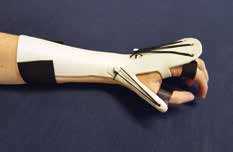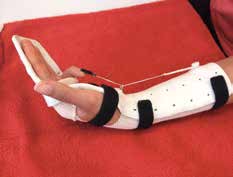 - Eine weitere Schienenart, die Ergotherapeuten anfertigen, sind Funktionsersatzschienen, beispielsweise nach Nervenausfällen. In Abbildung 7 wird das Beispiel einer Radialisersatzschiene gezeigt, die bei bestehender Fallhand das Handgelenk in Extension stabilisiert und die Finger sowie den Daumen in einer funktionellen Ausgangsstellung für die Greiffunktion hält.