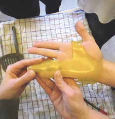 Da die Anfertigung der Schiene umfassende Kenntnisse über die Möglichkeiten und Einschränkungen des Patienten voraussetzt, erfolgt zunächst eine Funktionsanalyse, die im Rahmen der entsprechenden Heilmittelbehandlung abgerechnet werden kann. Darin wird der Patient auch über das Procedere des Schienenbaus aufgeklärt; es werden Sinn und Zweck der Schiene erläutert und die Materialwahl besprochen. Dann erfolgt die Schienenanpassung, entweder bei einem zweiten oder ggf. auch am selben Termin. Der Patient ist während des Fertigungsprozesses zugegen und bekommt die Schiene anschließend ausgehändigt. Oftmals wird vor der eigentlichen Schienenanpassung ein Schnittmuster angefertigt, um eine hohe Passgenauigkeit der Schiene im Anschluss zu gewährleisten (Abb. 3). Dieses wird dann auf das thermoplastische Material übertragen, das Material erwärmt, zurechtgeschnitten und an die Hand des Patienten angepasst. Nach ggf. notwendigen Korrekturen kann eine Auspolsterung der Schiene mittels verschiedener Materialien (z. B. Frottee, Stoff, Silikon) erfolgen.