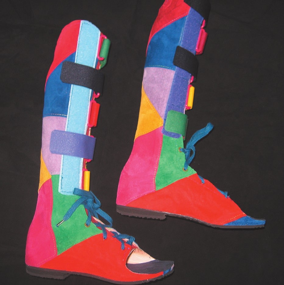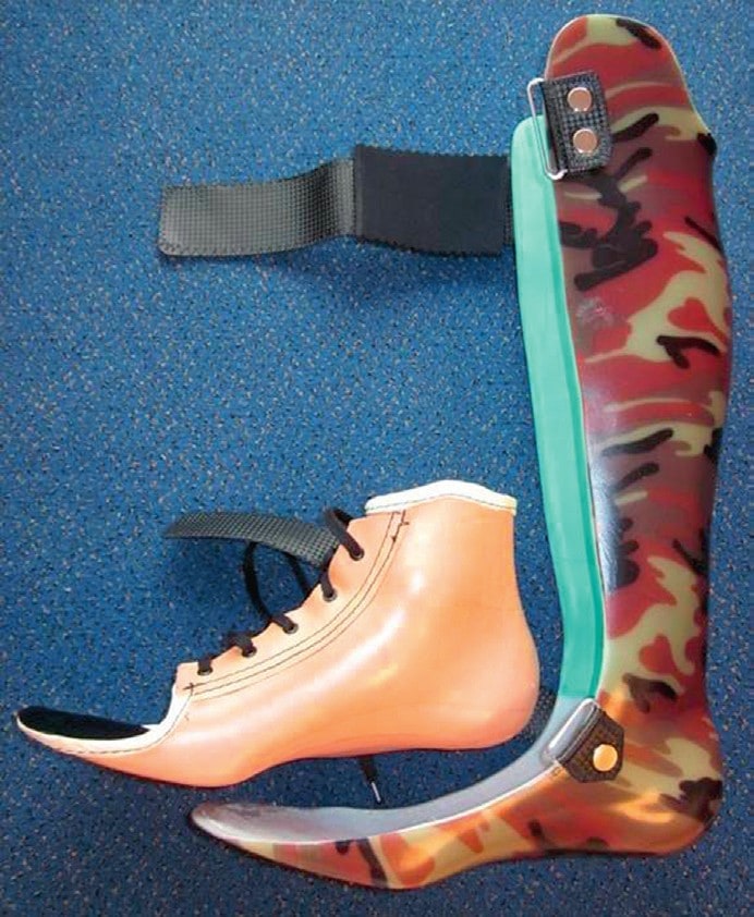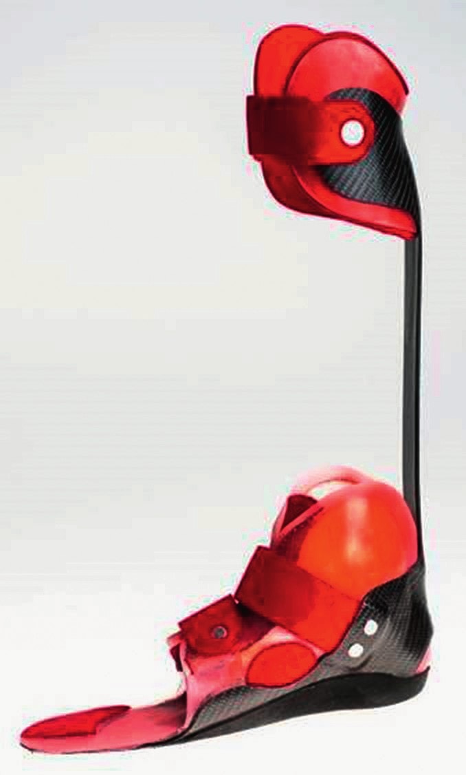 Der GMFCS-Level-II-Patient wird in aller Regel aufgrund seiner stärkeren motorischen Beeinträchtigung einen höheren Bedarf an Hilfsmitteln haben, z. B. mit knöchelübergreifenden Versorgungen (orthopädische Maßschuhe, orthopädischer Innenschuh, Sprunggelenksorthesen), da hier aufgrund der neurologischen Schädigung die Tonusverhältnisse häufig eine stärkere Korrektur und Stabilisierung benötigen, um unter Belastung den Korrekturbefund sichern zu können. Auch höhergreifende Versorgungen z. B. im Sinne von Unterschenkelorthesen sind im Einzelfall notwendig (Abb. 1). Nicht selten tragen diese höhergreifenden Versorgungen zu einer höheren statomotorischen Kontrolle bei, die sich in einer verbesserten Gangqualität und Gangsicherheit widerspiegelt. Häufig sind bei den Level-II-Patienten hochdynamische Versorgungen mit einer sehr gut ausgeformten individuellen plantaren Fußgewölbeausformung mit individuellem Korrekturzonen und achsengerechter Einstellung des Rückfußes angezeigt. In aller Regel sollte es gelingen, durch die Auswahl moderner Materialien und die körpernahe Bauweise das Orthesenvolumen so zu minimieren, dass konfektioniertes Schuhwerk getragen werden kann. Dies wird die Hilfsmittelakzeptanz erhöhen, die Tragezeit verlängern und so den Korrektureffekt verbessern. Die Schuhversorgung ist eine wichtige Komponente, die zum einen die Orthese sicher aufnehmen muss und zum anderen die Bodenreaktionskräfte in die unteren Extremitäten und in den gesamten Körper einleitet. Daher ist auch hier eine genaue klinische Kontrolle des Gangbildes notwendig, um eventuell mit einer Schuhzurichtung das Gangbild zu stabilisieren. Nicht selten tragen diese höhergreifenden Versorgungen zu einer höheren statomotorischen Kontrolle bei, die sich in einer verbesserten Gangqualität und Gangsicherheit widerspiegelt.