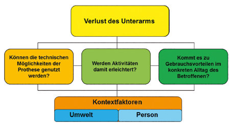 Das der ICF zugrunde liegende Verständnis der Wechselwirkungen zwischen den verschiedenen Komponenten kann für die Indikationsstellung bezüglich neuer Prothesen(passteile) genutzt werden (Abb. 1). Auf der Ebene der Körperfunktionen und ‑strukturen stellt sich die Frage, ob die technischen Möglichkeiten der Prothese überhaupt genutzt werden können. Kann dies bejaht werden, ist zu klären, welche (alltagsrelevanten) Aktivitäten dadurch erleichtert werden und wie sich dies auf die Teilhabe auswirkt 2 34. Besonders wichtig sind dabei Kontextfaktoren, die den Lebenshintergrund einer Person abbilden. Sie können sich positiv (Förderfaktoren), aber auch negativ (Barrieren) auf die Nutzung und Auswahl der neuen Prothese auswirken. Weitere wichtige Kriterien für die Prothesenauswahl sind: