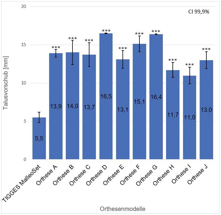 Die Ergeb­nis­se kön­nen dem Säu­len­dia­gramm in Abbil­dung 5 ent­nom­men wer­den. Die errech­ne­ten Mit­tel­wer­te bei einer Kraft­ein­wir­kung von 145 New­ton lie­gen in einem Bereich von 5,5 bis 16,5 mm Talus­vor­schub. Es ist zu erken­nen, dass sich die „Tig­ges MalleoSet“-Sprungelenkorthese mit einem Mit­tel­wert von nur 5,5 mm Talus­vor­schub signi­fi­kant von den ande­ren Orthe­sen abgrenzt, die deut­lich höhe­re Mit­tel­wer­te (zwi­schen 11 und 16,5 mm Talus­vor­schub) auf­wei­sen; die Stan­dard­ab­wei­chun­gen lie­gen in einem Bereich von 0,03 bis 1,52 mm. Die modu­la­re Stun­ge­lenk­or­the­se zeigt also im Ver­gleich zu allen ande­ren gemes­se­nen Orthe­sen einen deut­lich redu­zier­ten Talus­vor­schub-Wert. Die­ser Unter­schied ist in allen Fäl­len nach Aus­wer­tung durch einen t‑Test auf einem 99,9-%-Niveau signi­fi­kant. Im Ver­gleich zum zweit­kleins­ten gemes­se­nen Talus­vor­schub-Wert von 11 mm, der bei Orthe­se I auf­tritt, ist der Wert der „Tig­ges MalleoSet“-Orthese mit 5,5 mm nur unge­fähr halb so groß. Auf­fäl­lig ist, dass bei den Orthe­sen D und G eine sehr klei­ne Stan­dard­ab­wei­chung auf­tritt, die sich deut­lich von denen der ande­ren Orthe­sen abhebt. Das ist dar­auf zurück­zu­füh­ren, dass bei den Mes­sun­gen die­ser Orthe­sen die Test­ap­pa­ra­tur ihren mecha­ni­schen Anschlag erreich­te. Somit las­sen die­se Orthe­sen in der Rea­li­tät einen grö­ße­ren Talus­vor­schub zu, als in den Mes­sun­gen ermit­telt wer­den konnte.