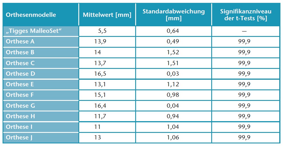 In der hier vor­ge­stell­ten Stu­die wur­de expe­ri­men­tell ermit­telt, dass die neu ent­wi­ckel­te „Tig­ges MalleoSet“-Sprunggelenkorthese im Ver­gleich mit allen ande­ren Orthe­sen der­sel­ben Pro­dukt­art den größ­ten Sta­bi­li­sie­rungs­ef­fekt gegen­über einer Talus­vor­schub­be­we­gung bie­tet. Die­ses Ergeb­nis konn­te in drei ver­schie­de­nen Mess­si­tua­tio­nen mit einem Signi­fi­kanz­ni­veau von 99,9 % fest­ge­stellt werden.