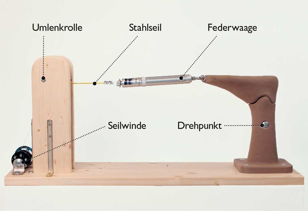 In der Test­ap­pa­ra­tur wird eine Talus­vor­schub­kraft über ein Stahl­seil gene­riert, das über eine rei­bungs­ar­me und orts­sta­bi­le Umlenk­rol­le läuft. Dadurch bleibt die Rich­tung der ein­wir­ken­den Kraft in allen Mess­si­tua­tio­nen gleich. Die auf­zu­brin­gen­de Kraft wird über eine Seil­win­de mit Sperr­klin­ken erzeugt. Die­se ermög­licht es, die Kraft schritt­wei­se zu erhö­hen. Wei­ter­hin sorgt ein zwi­schen­ge­schal­te­tes Kraft­mess­ge­rät in Form einer Feder­waa­ge dafür, dass stets die­sel­be Kraft bei allen Mes­sun­gen ver­wen­det wird.