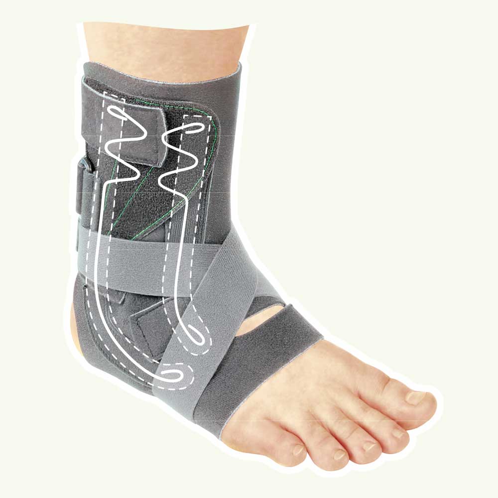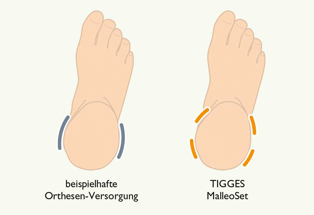 In einem For­schungs­pro­jekt der Tig­ges-Zours GmbH (Hat­tin­gen, Deutsch­land) wur­de ein neu­ar­ti­ges Orthe­sen­kon­zept mit Mobi­li­sie­rungs­funk­ti­on ent­wi­ckelt, das in der ers­ten Stu­fe dar­auf aus­ge­rich­tet ist, Talus­vor­schub­be­we­gun­gen in beson­ders hohem Maß zu limi­tie­ren. Für die zwei­te The­ra­pie­stu­fe wer­den die aus Feder­stahl­draht gefer­tig­ten Ver­stär­kungs­ele­men­te ent­fernt und somit kon­trol­lier­te Bewe­gun­gen frei­ge­ge­ben. Die drit­te Stu­fe wird durch das Able­gen des Sta­bi­li­sie­rungs­gurts ein­ge­lei­tet und zielt dar­auf ab, das Gelenk an nor­ma­le Belas­tun­gen her­an­zu­füh­ren. Die­ses Kon­zept ermög­licht eine the­ra­pie­ge­rech­te Ver­sor­gung wäh­rend der Entzündungs‑, der Pro­li­fe­ra­ti­ons- sowie der Remo­du­la­ti­ons­pha­se der Bandheilung.