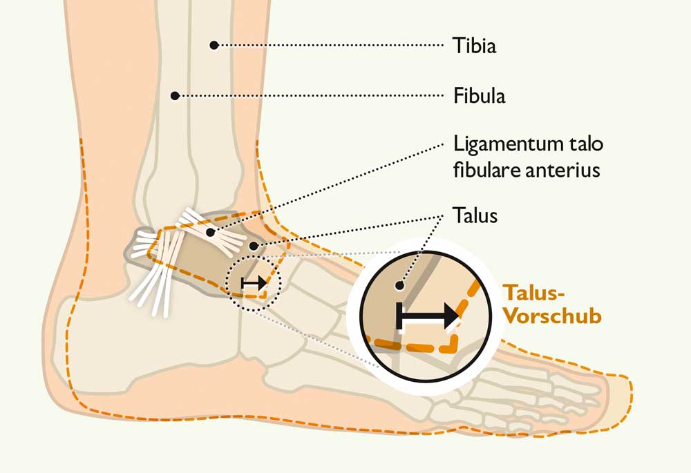 Die Bän­der im Knö­chel­be­reich haben die Auf­ga­be, die knö­cher­nen Gelenk­part­ner unter einer gewis­sen Vor­span­nung zusam­men­zu­hal­ten. Durch Ver­let­zun­gen die­ser Bän­der nimmt die Vor­span­nung ab; im schlimms­ten Fall ver­lie­ren Tibia und Fibu­la ihren direk­ten Kon­takt zuein­an­der. Das Ergeb­nis einer sol­chen Insta­bi­li­tät besteht dar­in, dass der Talus nicht mehr fest von der Mal­leo­len­ga­bel geführt wird; die mög­li­chen Bewe­gun­gen beschrän­ken sich nicht mehr rein auf das phy­sio­lo­gi­sche Bewe­gungs­aus­maß inner­halb der mono­zen­trisch ange­nom­me­nen Gelenk­ach­se. Durch die häu­fig auf­tre­ten­de Rup­tur des Liga­men­tum talo­fi­bu­la­re ante­rius ent­steht eine Ver­schieb­bar­keit des Talus im Ver­hält­nis zur Mal­leo­len­ga­bel. Die­ses Phä­no­men wird als „Talus­vor­schub“ bezeich­net, da sich der Talus nun nach ante­rior aus der Mal­leo­len­ga­bel her­aus­zie­hen lässt (Abb. 1).