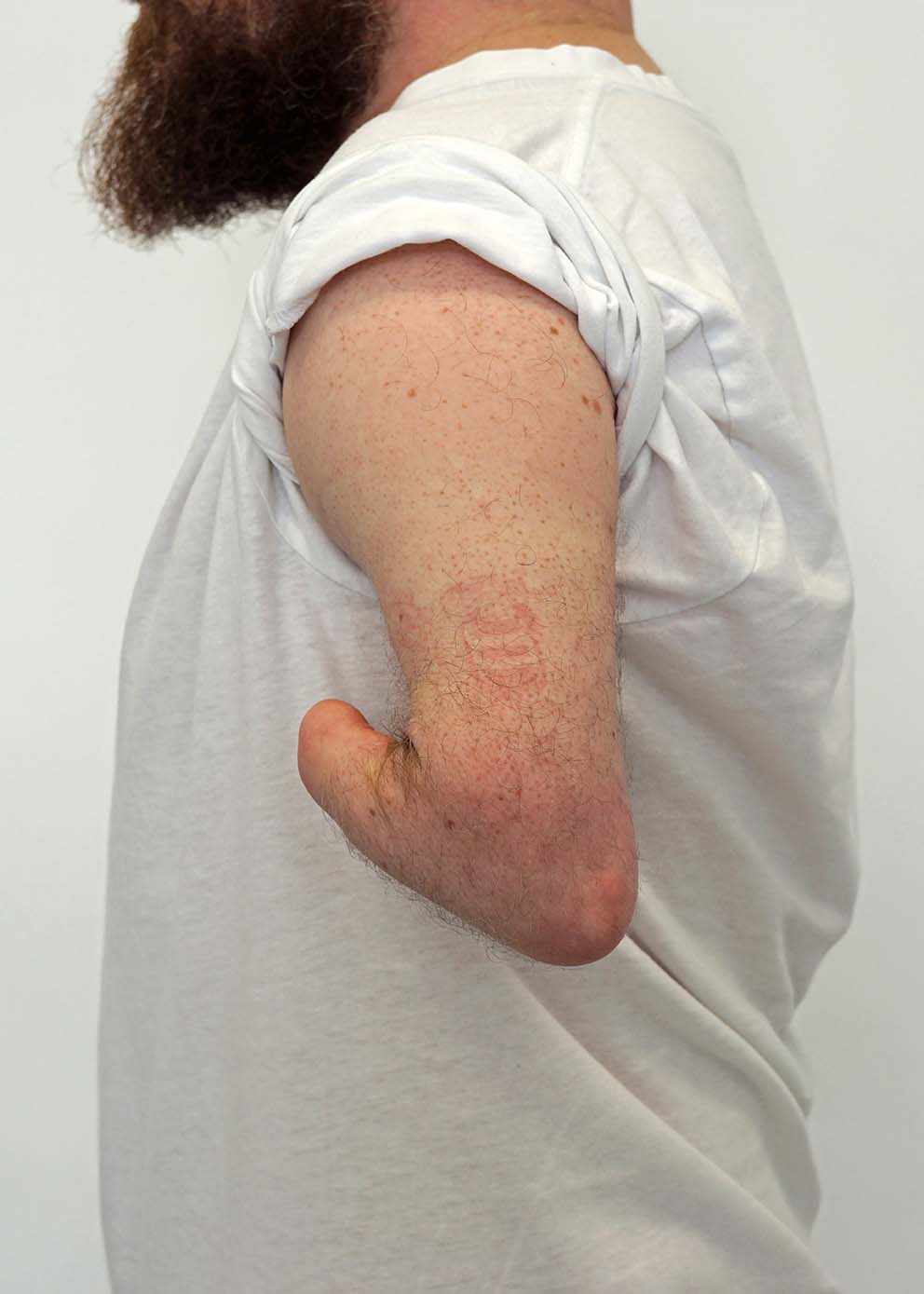 Der zu versorgende 35-jährige Patient stellte sich mit einer angeborenen Fehlbildung (Dysmelie) der linken oberen Extremität vor, die sich in einem um ca. 7 cm verkürzten Oberarm und einem nur ca. 12 cm langen Unterarm äußert. Die Hand fehlt gänzlich. Der Bewegungsumfang im Ellenbogengelenk liegt bei 0/90/125 (Abb. 1a u. b). Der Patient wurde seit dem 3. Lebensjahr mit Habitus-Prothesen und seit dem 12. Lebensjahr mit myoelektrischen Armprothesen versorgt. Bestand somit anfangs das Ziel der Versorgung ausschließlich darin, einen Ausgleich des physiologischen Erscheinungsbildes zu schaffen, stand später – mit der myoelektrischen Versorgung – der Wunsch des Greifens im Vordergrund. Die bisherige Versorgung besteht dabei aus einem Unterarmprothesenteil, das mit dem Unterarmstumpf eine Einheit bildet, sowie einer Myo-Hand mit einer an seitlichen Schienen verbundenen Oberhülse, in der die beiden Sensoren für die Ansteuerung integriert sind. Die Kabel der Sensoren verlaufen außerhalb und gelenkübergreifend von der Oberhülse in den Unterarm zur Hand. Die Prothese wird vom Patienten vor allem während der Ausübung seines Hobbys – dem Restaurieren von Motorrädern und Automobilen – genutzt. Durch den geringen Bewegungsumfang im Ellenbogengelenk von ca. 35° ist die Armprothese aber nur begrenzt einsetzbar (Abb. 2a). Zudem ist aufgrund der unterschiedlichen Oberarmlänge (Abb. 2b) ein entspanntes Sitzen mit einem Ablegen der Arme auf dem Tisch oder den Beinen nicht möglich (Abb. 2c), ohne die fehlende Armlänge links mit dem Rumpf auszugleichen. Infolgedessen stellten sich alsbald stärkere Rückenbeschwerden ein. Auch ein Verschränken der Arme als natürliche Körperhaltung ist nicht möglich. Die Frage, ob die Prothesenhand zum Mund geführt werden kann, erübrigte sich ebenso.