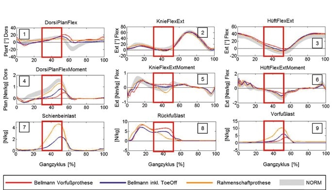 Beim Gehen in der Ebene zeigten sich Unterschiede zwischen den drei gemessenen Versorgungen in der terminalen Standphase (Abb. 2) (Tab. 1). Das Bewegungsausmaß ist demnach mit der Bellmann-Vorfußprothese am höchsten, gefolgt von der Kombination aus Bellmann und Toe-off-Orthese (Allard, USA) bis hin zum niedrigsten Wert in der Rahmenschaftprothese (Abb. 2a). Die beiden Versorgungen mit ventraler Anlage zeigen deutlich höhere extern dorsalflektierende Drehmomente (Abb. 2d). Die Schienbeinlast steigt ab ca. 20 % des Gangzyklus für beide Versorgungen mit ventraler Anlage an (Abb. 2g), was mit der Drehmomentkurve einhergeht. Die Rahmenschaftprothese zeigt das höchste extern dorsalflektierende Moment im OSG, die geringste Rückfußlast, aber die höchste Vorfußlast im Vergleich zu den anderen Versorgungsvarianten. Die Bellmann-Vorfußprothese inkl. Toe-off (Allard, USA) zeigt ein höheres externes dorsalflektierendes Drehmoment im OSG, eine geringere Rückfußlast sowie eine höhere Vorfußlast im Vergleich zur reinen Bellmann-Vorfußprothese. Sowohl das geringste externe dorsalflektierende Drehmoment als auch die niedrigste Vorfußlast zeigte sich bei der Bellmann-Vorfußprothese, hingegen aber die höchste Rückfußlast (Abb. 2 d, h, i).