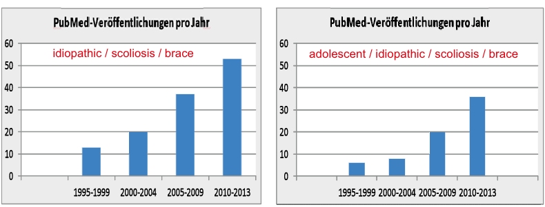 Anhand der gelisteten Veröffentlichungen in PubMed (Abb. 1) wird deutlich, wie konsequent hier gearbeitet wurde. Auch durch Eingrenzung der Stichwörter kommt es zu keiner Verschiebung des Trends zur Erkenntniszunahme. Es muss an dieser Stelle darauf hingewiesen werden, dass in den ersten Jahren zwischen 1995 und 1999 noch einzelne Beiträge gelistet sind, die die Effektivität der Korsettbehandlung verneinen. Einen nicht zu vernachlässigenden Effekt brachte auch die Gründung einer eigenen Zeitschrift („Scoliosis”) der Gruppe SOSORT, die sich speziell der konservativen Skoliosebehandlung widmet. Da sich auch die SRS mit ihrem wissenschaftlichen Know-how sachlich dem Thema zuwandte, konnten Beweisführungen auf ungeahntem wissenschaftlichem Niveau erzielt werden – diese werden im folgenden Abschnitt dargelegt.