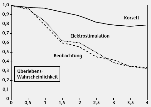 1995 waren es Alf L. Nachemson und Lars-Erik Peterson, die mit ihrer wissenschaftlichen Studie 1 die Korsettbehandlung vor dem wissenschaftlichen Untergang bewahrt haben. In ihrer prospektiven Studie konnte gezeigt werden, dass sich der Therapieerfolg bei Korsettbehandlung signifikant vom natürlichen Progredienzverlauf bei der idiopathischen Skoliose unterscheidet (Abb. 2). Dies mag heute wenig überraschen, war damals aber konträr zur Auffassung vieler renommierter Orthopäden.