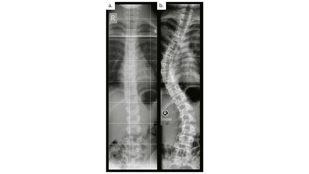 Fortgeschrittene idiopathische Skoliosen entstehen oft aus zunächst nahezu geraden Wirbelsäulen. Zwischen den beiden Röntgenaufnahmen (Abb. 1a und b) liegen nur fünf Jahre. Es ist die Kunst des Behandlungsteams aus Arzt, Physiotherapeut und Orthopädietechniker, im richtigen Augenblick die richtigen Therapien anzuwenden, um Progredienzen schonend und dennoch wirksam einzudämmen. Dabei ist das Team auf die Zuarbeit von Kinderärzten und die Mitarbeit der Patienten angewiesen. Es wird (trotz aller Bemühungen) immer Fälle geben, die mit einzelnen Therapieformen nicht beherrschbar sind, aber das ist kein Grund, am geeigneten Punkt auf mögliche Behandlungsschritte zu verzichten bzw. einzelne Therapieschritte auszulassen oder zu überspringen.